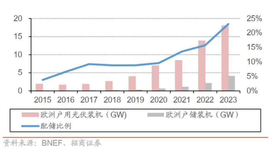 歐洲是過去戶儲主要市場,2023年全球新增戶儲裝機12GWh,同比增長59.3%,累計裝機規(guī)模達到33.8GWh。歐洲地區(qū)居民側(cè)電價構(gòu)成項多,電價水平高,安裝分布式光儲系統(tǒng)具有顯著經(jīng)濟性,是戶儲主要終端市場,2023年,歐洲戶儲累計裝機占全球總量的64%。