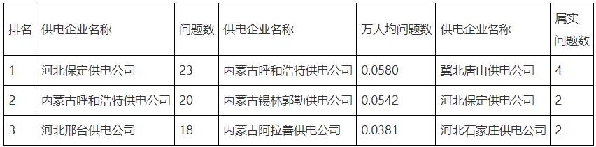 從反映供電企業(yè)問(wèn)題的數(shù)量看,河北保定供電公司數(shù)量最多;從萬(wàn)人均反映問(wèn)題數(shù)量來(lái)看,內(nèi)蒙古呼和浩特供電公司最多。辦結(jié)的工單中(含往月結(jié)轉(zhuǎn))共12個(gè)屬實(shí)(或部分屬實(shí))問(wèn)題。2022年9月份反映供電企業(yè)問(wèn)題的工單數(shù)量排名情況見(jiàn)表9 。