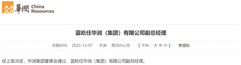 12月7日,經(jīng)上級決定,華潤集團(tuán)董事會(huì)通過,藍(lán)屹任華潤(集團(tuán))有限公司副總經(jīng)理。