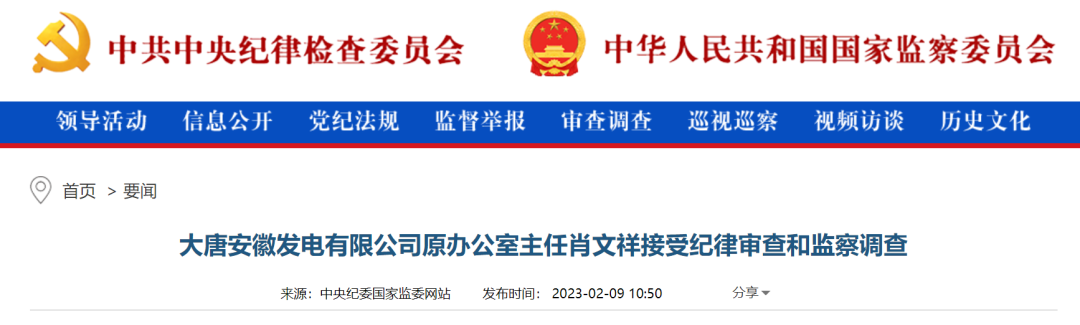 中央紀(jì)委國(guó)家監(jiān)委網(wǎng)站訊2月9日消息,據(jù)中國(guó)大唐集團(tuán)有限公司紀(jì)檢監(jiān)察組、安徽省監(jiān)察委員會(huì)消息:大唐安徽發(fā)電有限公司原辦公室主任肖文祥涉嫌嚴(yán)重違紀(jì)違法,目前正接受中國(guó)大唐集團(tuán)有限公司紀(jì)檢監(jiān)察組紀(jì)律審查和安徽省淮北市監(jiān)察委員會(huì)監(jiān)察調(diào)查。