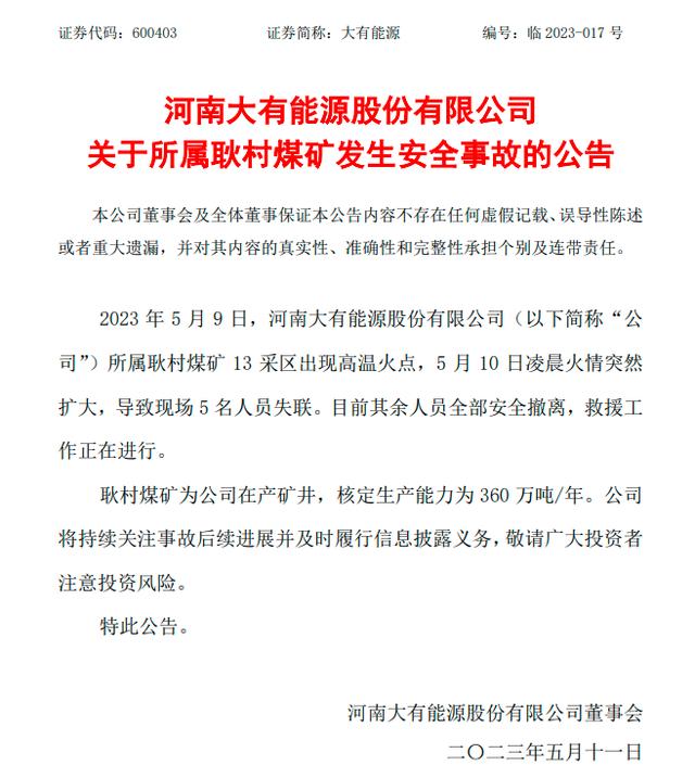 2023年5月9日,河南大有能源股份有限公司耿村煤礦13采區(qū)出現(xiàn)高溫火點,5月10日凌晨火情突然擴大,導致現(xiàn)場5名人員失聯(lián)。