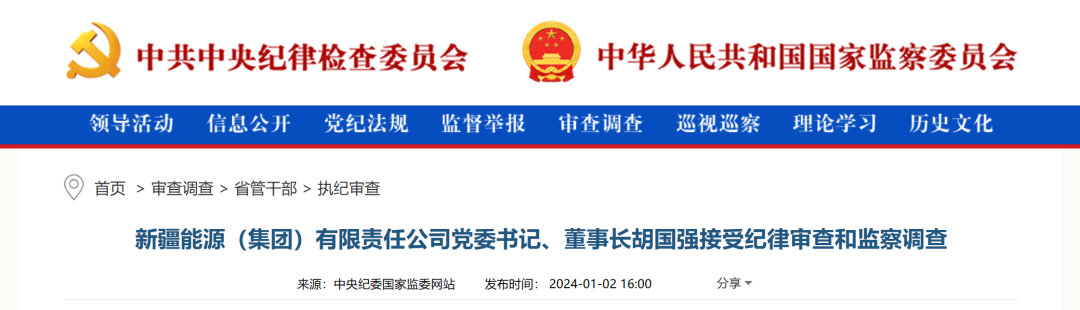 據(jù)中央紀委國家監(jiān)委網(wǎng)站1月2日消息,據(jù)新疆維吾爾自治區(qū)紀委監(jiān)委消息:新疆能源(集團)有限責任公司黨委書記、董事長胡國強涉嫌嚴重違紀違法,目前正接受新疆維吾爾自治區(qū)紀委監(jiān)委紀律審查和監(jiān)察調(diào)查。