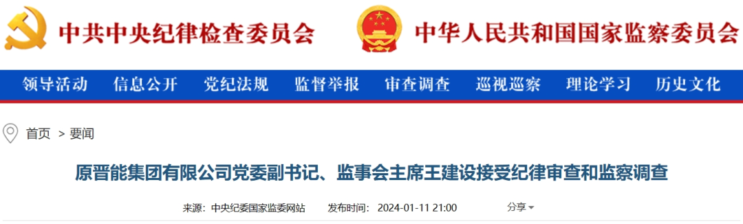中央紀委國家監(jiān)委網(wǎng)站1月11日消息,據(jù)山西省紀委監(jiān)委消息:原晉能集團有限公司黨委副書記、監(jiān)事會主席王建設(shè)涉嫌嚴重違紀違法,目前正接受山西省紀委監(jiān)委紀律審查和監(jiān)察調(diào)查。