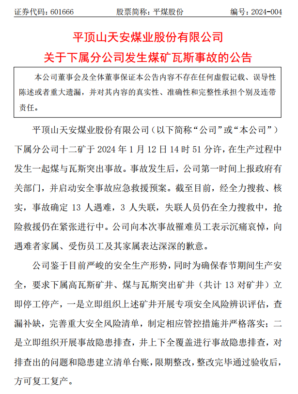 1月14日訊,平煤股份公告,下屬分公司十二礦于1月12日14時51分許,在生產(chǎn)過程中發(fā)生一起煤與瓦斯突出事故。截至目前,經(jīng)全力搜救、核實(shí),事故確定13人遇難,3人失聯(lián),失聯(lián)人員仍在全力搜救中,搶險救援仍在緊張進(jìn)行中。
