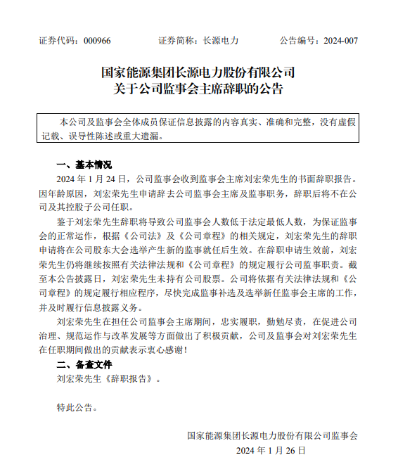 劉宏榮辭去國家能源集團(tuán)長源電力股份有限公司(以下簡稱“長源電力”)監(jiān)事會(huì)主席及監(jiān)事職務(wù)。