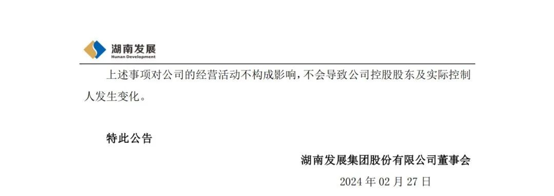 2月27日,湖南發(fā)展集團(tuán)股份有限公司發(fā)布關(guān)于控股股東變更名稱及注冊(cè)資本的公告,公告顯示:湖南發(fā)展集團(tuán)股份有限公司于近日收到公司控股股東通知,根據(jù)湖南省人民政府辦公廳《關(guān)于印發(fā)<湖南省能源投資集團(tuán)有限公司組建方案>的通知》(湘政辦函〔2024〕9號(hào)),公司控股股東名稱由“湖南湘投控股集團(tuán)有限公司”變更為“湖南省能源投資集團(tuán)有限公司”,注冊(cè)資本由150億元變更為300億元。除上述變更外,營業(yè)執(zhí)照其他登記信息不變。公司控股股東已在湖南省市場(chǎng)監(jiān)督管理局完成工商變更登記手續(xù)。