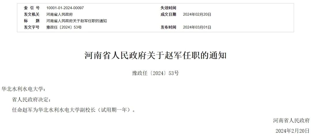 據(jù)河南人民政府網(wǎng)站3月1日消息,河南省人民政府決定:任命趙軍為華北水利水電大學(xué)副校長(試用期一年)。
