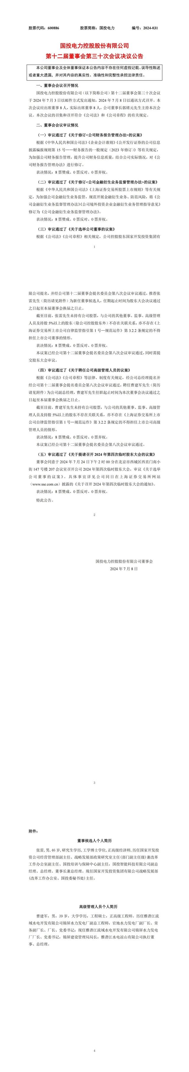 7月8日,國(guó)投電力召開董事會(huì),審議通過(guò)了《關(guān)于聘任公司高級(jí)管理人員的議案》,聘任曹建軍先生為公司副總經(jīng)理,曹建軍先生任職起止時(shí)間為本次董事會(huì)決議通過(guò)之日起至本屆董事會(huì)換屆之日止;推薦張雷為新任董事候選人。