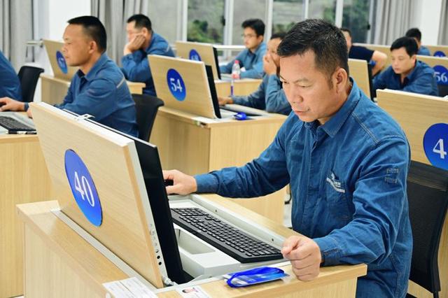 在理論考試現(xiàn)場,選手正在認真答題。韋靜攝