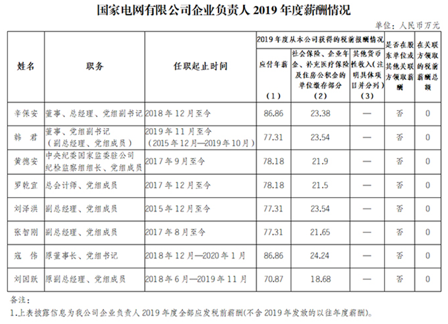 中國電力網(wǎng)(微信公眾號(hào):China_Power_com_cn)獲悉,近日,國家電網(wǎng)、南方電網(wǎng)、華能集團(tuán)、國家能源集團(tuán)、中廣核、中國能建、中國電建等能源電力央企發(fā)布了企業(yè)負(fù)責(zé)人2019年度薪酬情況。