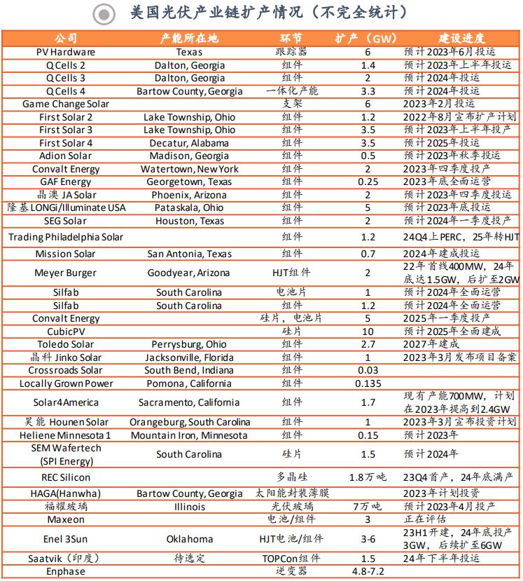 來源:InfoLink,Solar Power World,SEIA,Wood Mackenzie,平安證券(上述項目暫未計入阿特斯7月剛宣布的5GW美國工廠計劃)