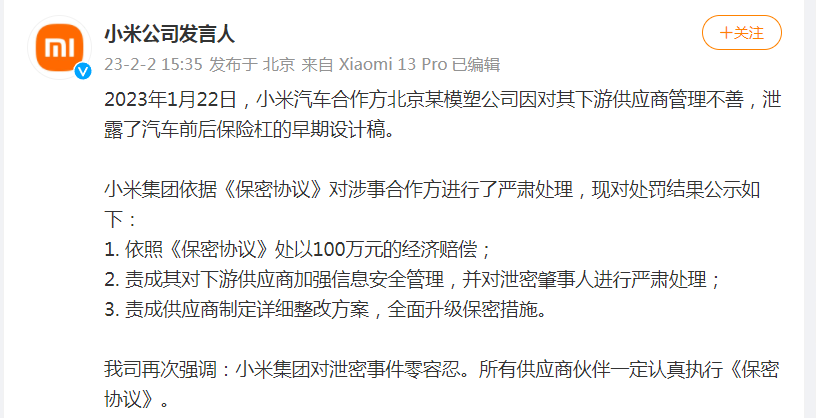 《聲明》稱,2023年12月17日,媒體“ZAKER”員工包某某、“小白買車”員工關某某,在簽署《保密承諾書》、明知保密義務與相應罰則的情況下,未經許可有意泄露保密拍攝內容。經小米集團保密管理團隊查實,以上兩人已承認其違反保密義務的行為。經與其所屬媒體溝通,小米集團將依據雙方簽署的《保密承諾書》相應條款追究兩人及所屬媒體泄密責任,包括并不限于公開道歉、罰金。另外,《聲明》介紹,2023年11月和12月,小米汽車部三名前員工于在職期間,以收取“咨詢費用”為目的,未經許可擅自參與外部券商、投資機構組織的所謂“小米汽車研討會”,臆造傳播大量錯誤、不實信息,嚴重誤導市場、擾亂小米汽車正常業(yè)務開展。以上三名員工,即于某某(前電控系統與軟件團隊員工)、施某(前沖鑄工藝團隊員工)、張某(前量產質量團隊員工),嚴重違背《小米集團員工行為準則》及公司規(guī)定的保密義務,小米集團已對其做辭退處理、永不錄用,并依法追究法律責任。同時,小米集團表示,對組織相關活動的券商、投資機會,保留追究法律責任的權利。小米汽車始終吸引市場高度關注,這也不是小米集團第一次遭遇汽車泄密。今年1月22日,小米汽車合作方北京某模塑科技有限公司因對其下游供應商管理不善,泄露了小米汽車前后保險杠的早期設計稿。“小米公司發(fā)言人”微博今年2月更新了該泄密事件的處理結果:小米集團表示,已依據《保密協議》對涉事合作方進行了嚴肅處理,包括依照《保密協議》處以100萬元的經濟賠償;責成其對下游供應商加強信息安全管理,并對泄密肇事人進行嚴肅處理;責成供應商制定詳細整改方案,全面升級保密措施。