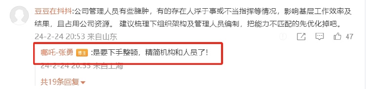 值得一提的是,在該條微博評論區(qū),張勇對有網(wǎng)友建議“梳理組織架構(gòu)及管理人員編制,把能力不匹配的先優(yōu)化掉”的評論進行了回復,其表示,“是要下手整頓,精簡機構(gòu)和人員了。”