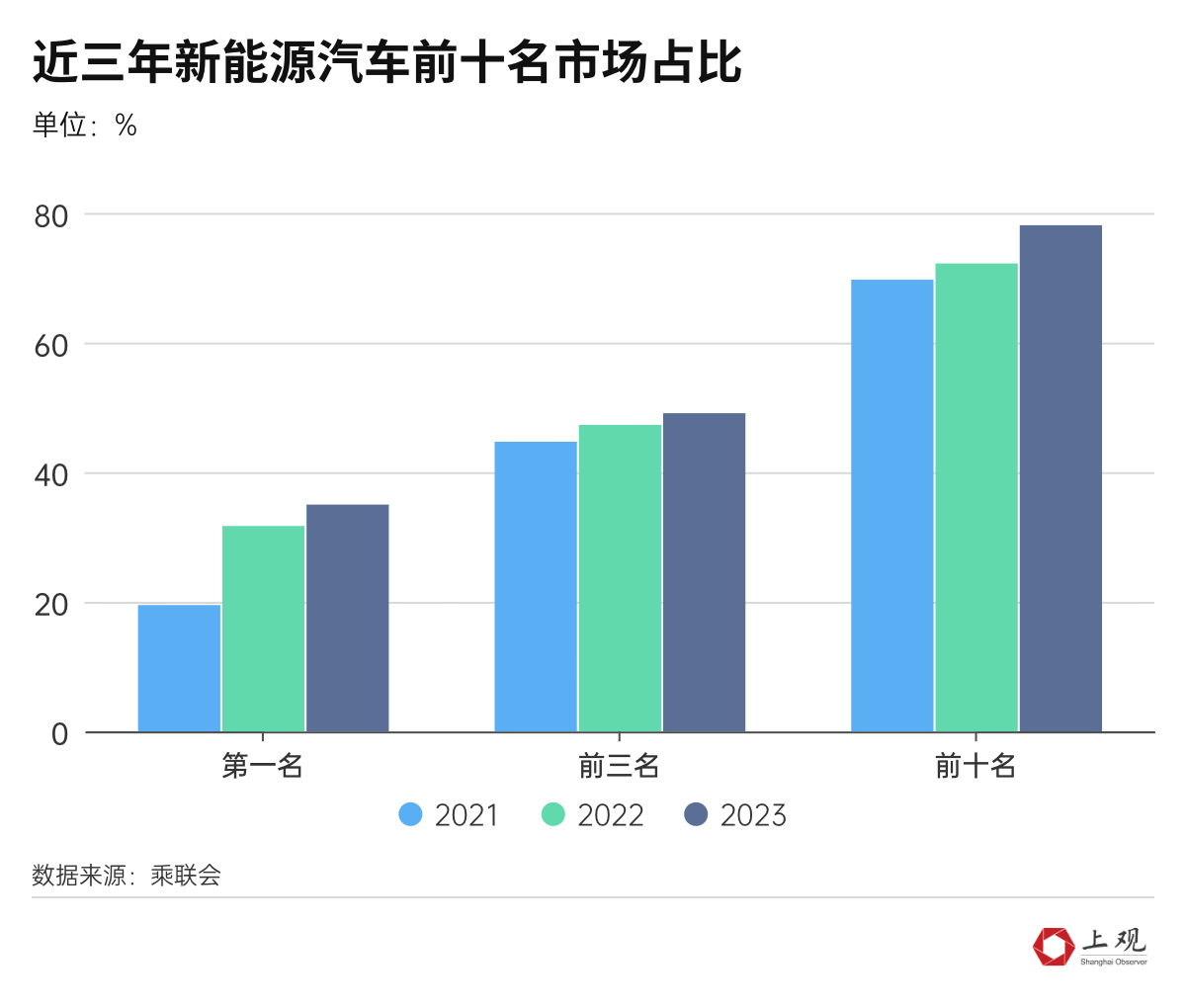 目前來(lái)看,誰(shuí)贏還真說不定,但尾部企業(yè)肯定日子更難。政府補(bǔ)貼退坡后,新能源汽車銷量本來(lái)就越來(lái)越集中在頭部企業(yè)。最近三年,前十名的市場(chǎng)占比增加了約10%,接近80%。銷量第一名的比亞迪,所占的市場(chǎng)份額達(dá)到35%。而在2021年,這一占比僅為19.5%。
