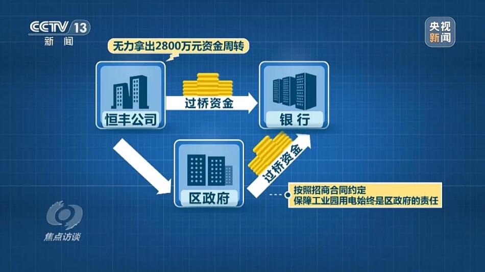 河南省駐馬店市經(jīng)濟(jì)開(kāi)發(fā)區(qū)管委會(huì)副主任安寧:過(guò)橋資金2800萬(wàn),他自己拿不起,讓政府協(xié)調(diào)過(guò)橋資金,政府又為了免于擔(dān)風(fēng)險(xiǎn),幾經(jīng)努力,最后這個(gè)事沒(méi)有做成。說(shuō)是為了免擔(dān)風(fēng)險(xiǎn),區(qū)政府沒(méi)有幫助協(xié)調(diào)下過(guò)橋資金,但是,也沒(méi)有履行確保恒豐公司用電負(fù)荷的約定。當(dāng)?shù)亟o產(chǎn)業(yè)園提供的一直是建設(shè)廠(chǎng)房時(shí)的臨時(shí)用電,220千伏變電站沒(méi)有如期建成,對(duì)企業(yè)造成的影響,當(dāng)?shù)卣质侨绾慰创哪?河南省駐馬店市經(jīng)濟(jì)開(kāi)發(fā)區(qū)管委會(huì)副主任安寧:電力接上了,是臨時(shí)用電,建設(shè)期都給接了。記者:電力保障在前,還是應(yīng)該生產(chǎn)在前?河南省駐馬店市經(jīng)濟(jì)開(kāi)發(fā)區(qū)管委會(huì)副主任安寧:電力保障在前。記者:正式用電的電力保障一直沒(méi)有進(jìn)行的原因是什么呢?河南省駐馬店市經(jīng)濟(jì)開(kāi)發(fā)區(qū)管委會(huì)副主任安寧:這個(gè)你要問(wèn)當(dāng)事人。
