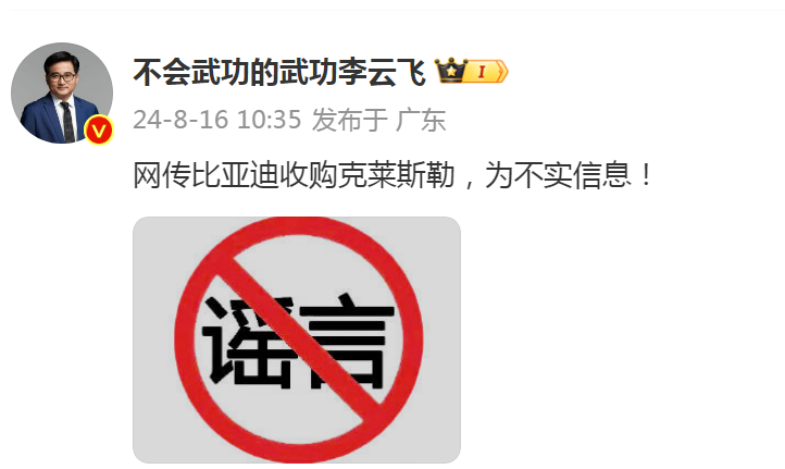 近日,有消息稱,比亞迪正推進(jìn)收購克萊斯勒。8月16日,比亞迪品牌與公關(guān)事業(yè)部總經(jīng)理李云飛在其個人微博上回應(yīng)稱上述消息不實(shí)。同日,比亞迪有關(guān)人士回應(yīng)媒體表示,公司對于收購克萊斯勒傳聞的態(tài)度與李云飛微博內(nèi)容一致。