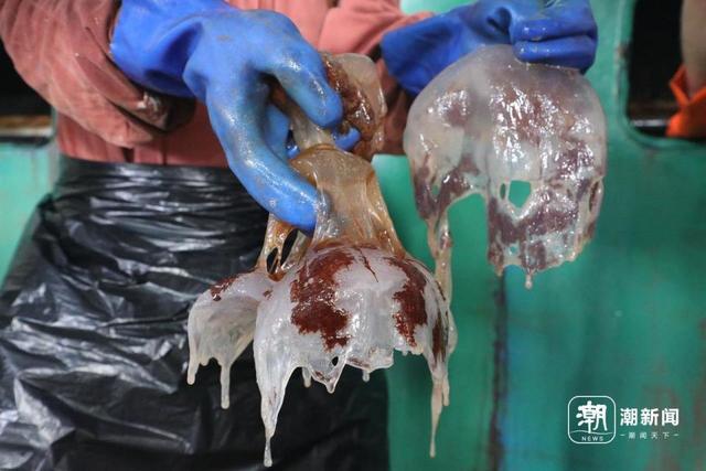 “抓海蜇的第一個(gè)小時(shí)還有點(diǎn)新鮮感,第二小時(shí)就不行了,腿酸。濾網(wǎng)時(shí)不時(shí)會(huì)有海水濺出來,整個(gè)人全部濕掉,又腥又臭。等到最后值班時(shí)間結(jié)束,雙腿沉得不像自己的。”有過來人這么形容和海蜇“戰(zhàn)斗”的感受。