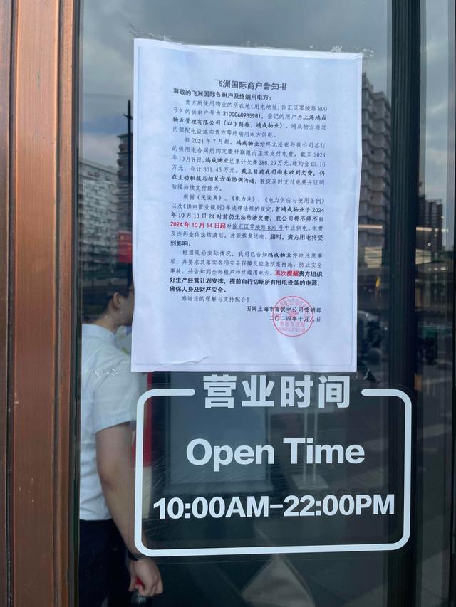 不過,在該商場(chǎng)門口、電梯口等多處地方都貼上了告示,上面寫著:自2024年7月起,鴻成物業(yè)無法在供電合同所約定繳付期限內(nèi)正常支付電費(fèi)。截至2024年10月8日,鴻成物業(yè)已累計(jì)欠費(fèi)288.29萬元、違約金13.16萬元,合計(jì)301.45萬元。若鴻成物業(yè)于2024年10月13日24時(shí)前仍無法結(jié)清欠費(fèi),國網(wǎng)上海市南供電公司不得不自2024年10月14日起,對(duì)零陵路899號(hào)中止供電。