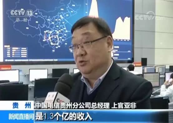 “中國電信貴州分公司總經(jīng)理 上官亞非:我們在2016年的時候是1500萬的收入,在2017年的時候是5300萬的收入,2018年本來定的計劃是八千萬的收入,結(jié)果現(xiàn)在我們統(tǒng)計出來是1.3個億的收入。增長超過百分之百。”