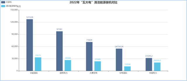 2022年,煤炭價格依舊處于高位,全年北方港5500大卡動力煤市場均價為1296元/噸,同比上漲24.2%。體現(xiàn)在業(yè)績層面上,“五大電”中清潔能源裝機(jī)占比越高的企業(yè),越能夠受益于這樣的市場環(huán)境,從而造成業(yè)績極端分化。