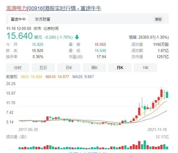 龍源電力(港股代碼00916),從2020年6月開始啟動,乘著市場猛炒新能源賽道東風(fēng),到目前已經(jīng)漲幅巨大,達(dá)到5倍。