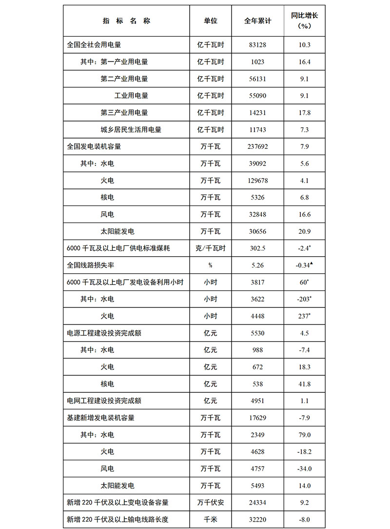 注:1.全社會(huì)用電量為全口徑數(shù)據(jù),全國供電量為調(diào)度口徑數(shù)據(jù)。2.“同比增長”列中,標(biāo)*的指標(biāo)為絕對量;標(biāo)▲的指標(biāo)為百分點(diǎn)。