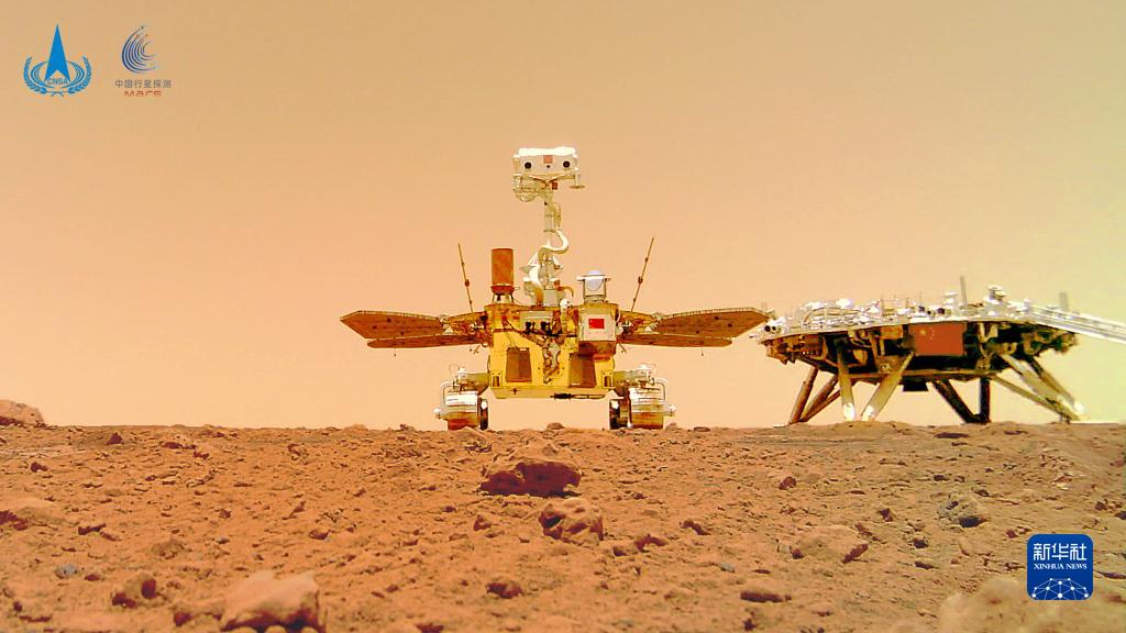 由祝融號火星車拍攝的著陸點全景、火星地形地貌、“中國印跡”和“著巡合影”等影像圖。