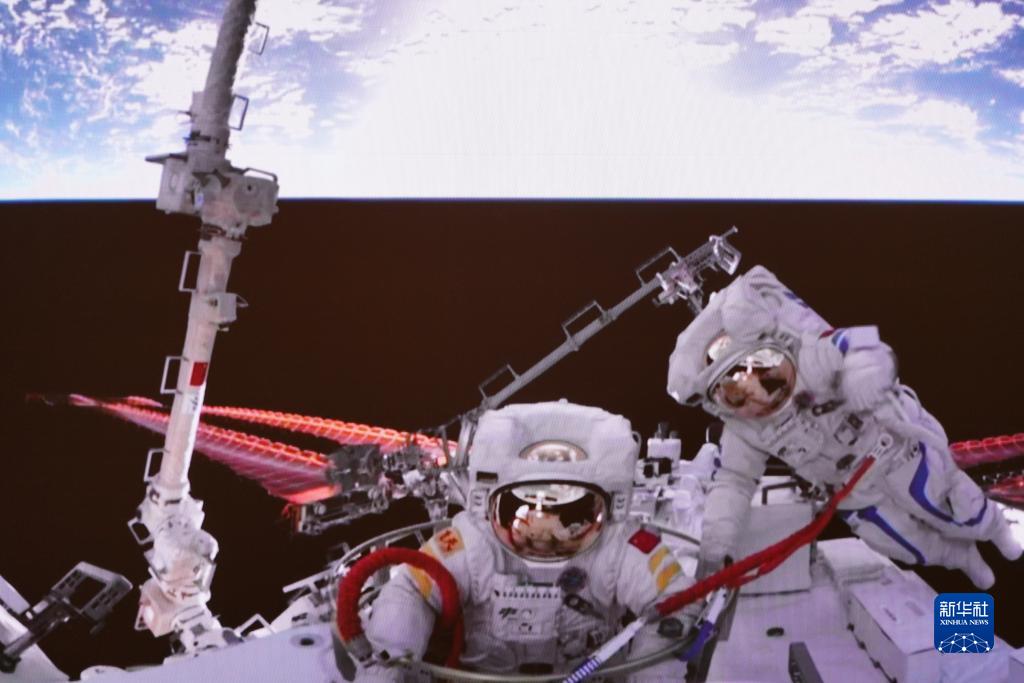 2022年9月2日在北京航天飛行控制中心拍攝的神舟十四號航天員劉洋(左)結(jié)束出艙任務(wù)正在返回的畫面。 新華社發(fā)(李杰攝)