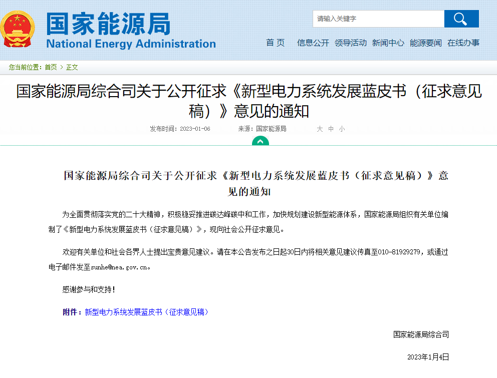 國家能源局綜合司關于公開征求《新型電力系統(tǒng)發(fā)展藍皮書(征求意見稿)》意見的通知