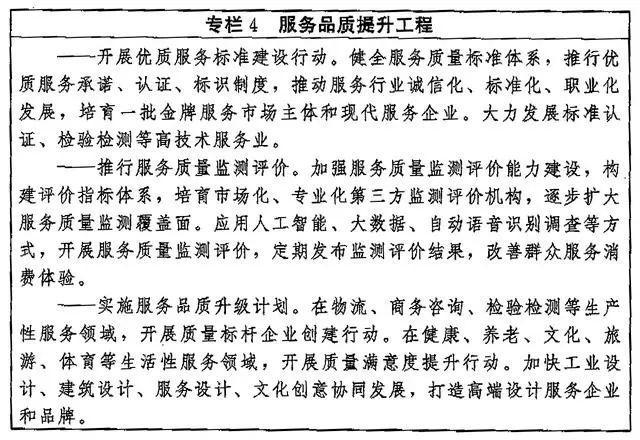 (七)提高產(chǎn)業(yè)質(zhì)量競(jìng)爭(zhēng)水平。推動(dòng)產(chǎn)業(yè)質(zhì)量升級(jí),加強(qiáng)產(chǎn)業(yè)鏈全面質(zhì)量管理,著力提升關(guān)鍵環(huán)節(jié)、關(guān)鍵領(lǐng)域質(zhì)量管控水平。開展對(duì)標(biāo)達(dá)標(biāo)提升行動(dòng),以先進(jìn)標(biāo)準(zhǔn)助推傳統(tǒng)產(chǎn)業(yè)提質(zhì)增效和新興產(chǎn)業(yè)高起點(diǎn)發(fā)展。推進(jìn)農(nóng)業(yè)品種培優(yōu)、品質(zhì)提升、品牌打造和標(biāo)準(zhǔn)化生產(chǎn),全面提升農(nóng)業(yè)生產(chǎn)質(zhì)量效益。加快傳統(tǒng)制造業(yè)技術(shù)迭代和質(zhì)量升級(jí),強(qiáng)化戰(zhàn)略性新興產(chǎn)業(yè)技術(shù)、質(zhì)量、管理協(xié)同創(chuàng)新,培育壯大質(zhì)量競(jìng)爭(zhēng)型產(chǎn)業(yè),推動(dòng)制造業(yè)高端化、智能化、綠色化發(fā)展,大力發(fā)展服務(wù)型制造。加快培育服務(wù)業(yè)新業(yè)態(tài)新模式,以質(zhì)量創(chuàng)新促進(jìn)服務(wù)場(chǎng)景再造、業(yè)務(wù)再造、管理再造,推動(dòng)生產(chǎn)性服務(wù)業(yè)向?qū)I(yè)化和價(jià)值鏈高端延伸,推動(dòng)生活性服務(wù)業(yè)向高品質(zhì)和多樣化升級(jí)。完善服務(wù)業(yè)質(zhì)量標(biāo)準(zhǔn),加強(qiáng)服務(wù)業(yè)質(zhì)量監(jiān)測(cè),優(yōu)化服務(wù)業(yè)市場(chǎng)環(huán)境。加快大數(shù)據(jù)、網(wǎng)絡(luò)、人工智能等新技術(shù)的深度應(yīng)用,促進(jìn)現(xiàn)代服務(wù)業(yè)與先進(jìn)制造業(yè)、現(xiàn)代農(nóng)業(yè)融合發(fā)展。