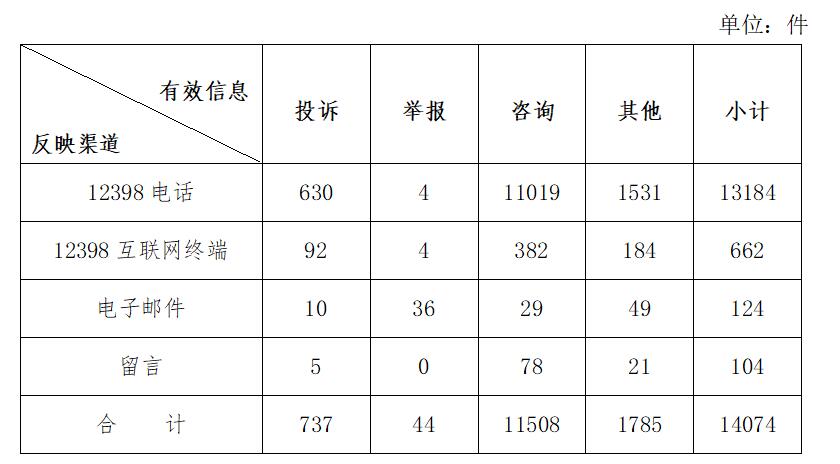 按反映渠道分類(lèi),12398電話(huà)13184件,12398互聯(lián)網(wǎng)終端662件,電子郵件124件,留言104件。