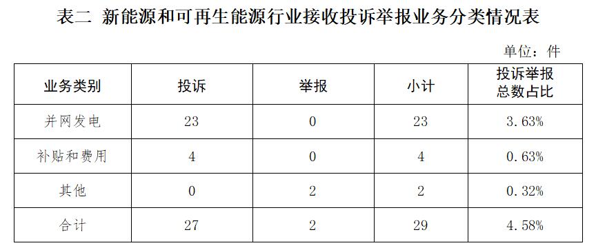 新能源和可再生能源行業(yè)排在第二位,數(shù)量為29件、占投訴舉報總數(shù)的4.58%,主要集中在并網(wǎng)發(fā)電、補(bǔ)貼和費(fèi)用等方面。(詳見表二)