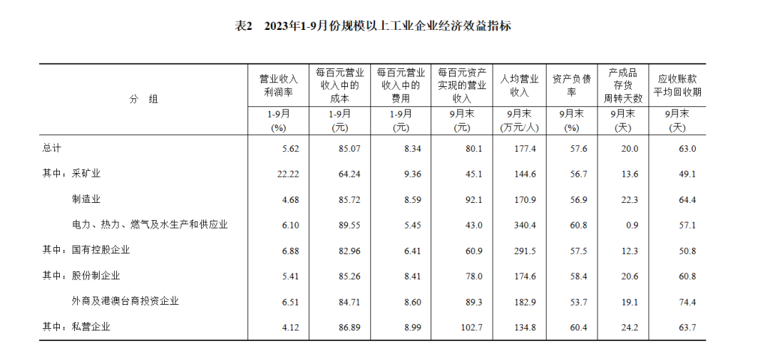 9月末,規(guī)模以上工業(yè)企業(yè)每百元資產實現(xiàn)的營業(yè)收入為80.1元,同比減少5.8元;人均營業(yè)收入為177.4萬元,同比增加6.0萬元;產成品存貨周轉天數為20.0天,同比增加1.2天;應收賬款平均回收期為63.0天,同比增加5.9天。