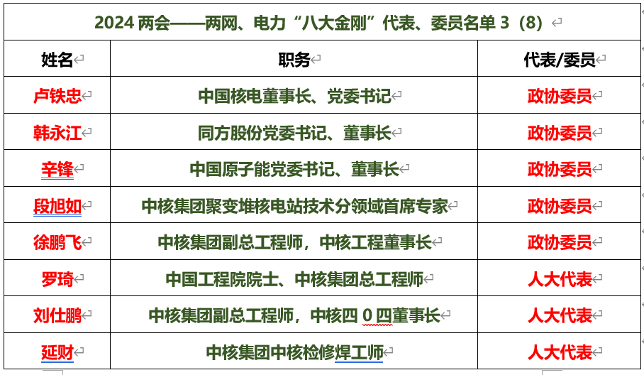 (1)楊長(zhǎng)利 中國(guó)廣核集團(tuán)董事長(zhǎng)、黨委書(shū)記(政協(xié)委員)