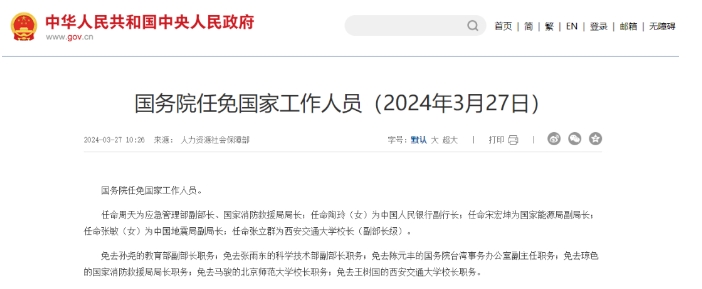 任命宋宏坤為國(guó)家能源局副局長(zhǎng);任命張敏(女)為中國(guó)地震局副局長(zhǎng);任命張立群為西安交通大學(xué)校長(zhǎng)(副部長(zhǎng)級(jí))。