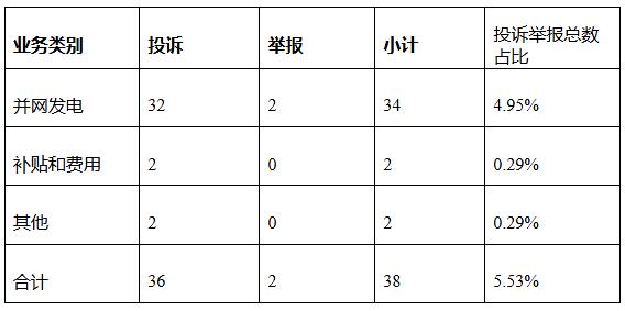 新能源和可再生能源行業(yè)排在第二位,數(shù)量為38件、占投訴舉報(bào)總數(shù)的5.53%,主要集中在并網(wǎng)發(fā)電方面。