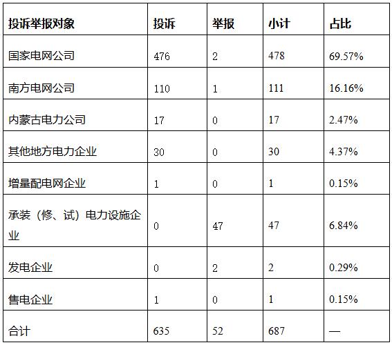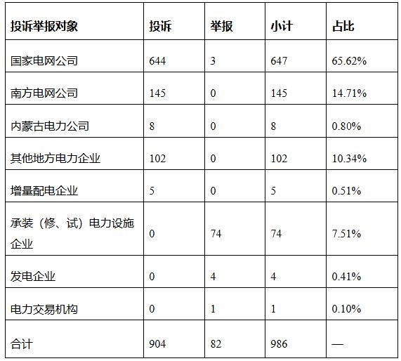 從被投訴舉報(bào)對(duì)象看,供電企業(yè)907件、占投訴舉報(bào)總數(shù)的91.99%,其中國(guó)家電網(wǎng)公司647件、占比65.62%,南方電網(wǎng)公司145件、占比14.71%,內(nèi)蒙古電力公司8件、占比0.8%,其他地方電力企業(yè)102件、占比10.34%,增量配電企業(yè)5件、占比0.51%;承裝(修、試)電力設(shè)施企業(yè)74件、占比7.51%;發(fā)電企業(yè)4件、占比0.41%;電力交易機(jī)構(gòu)1件、占比0.1%。