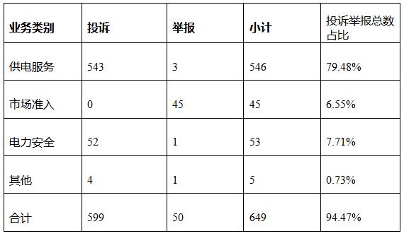 電力行業(yè)排在首位,數(shù)量為649件、占投訴舉報(bào)總數(shù)的94.47%,主要集中在供電服務(wù)、市場(chǎng)準(zhǔn)入、電力安全等方面。
