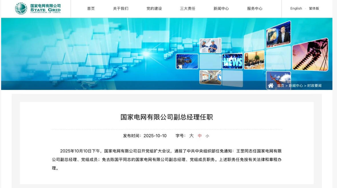2025年10月10日下午,國家電網(wǎng)有限公司召開黨組擴大會議,通報了中共中央組織部任免通知:王罡同志任國家電網(wǎng)有限公司副總經(jīng)理、黨組成員;免去陳國平同志的國家電網(wǎng)有限公司副總經(jīng)理、黨組成員職務。上述職務任免按有關法律和章程辦理。