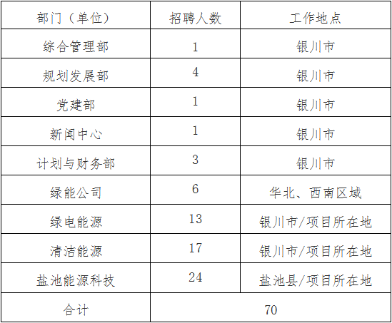 本次招聘總?cè)藬?shù)70人。其中公司本部10人(綜合管理部1人、規(guī)劃發(fā)展部4人、黨建部1人、新聞中心1人、計劃與財務(wù)部3人),綠能公司6人,綠電能源13人,清潔能源17人,鹽池能源科技24人。