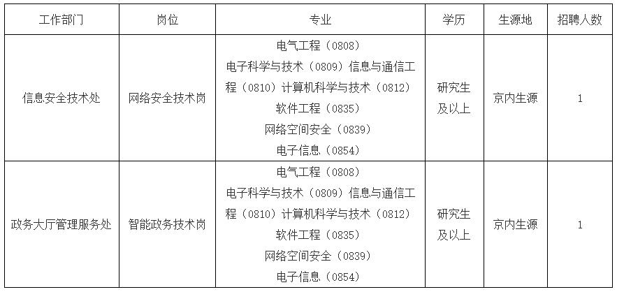 1.信息安全技術(shù)處:網(wǎng)絡(luò)安全技術(shù)崗工作人員1名(京內(nèi)生源研究生及以上應(yīng)屆畢業(yè)生)。專業(yè)為電氣工程(0808)、電子科學(xué)與技術(shù)(0809)、信息與通信工程(0810)、計(jì)算機(jī)科學(xué)與技術(shù)(0812)、軟件工程(0835)、網(wǎng)絡(luò)空間安全(0839)、電子信息(0854)。要求熟悉網(wǎng)絡(luò)安全和數(shù)據(jù)安全防護(hù)技術(shù)、法律法規(guī)和管理知識(shí),作風(fēng)正派、嚴(yán)謹(jǐn)細(xì)致、踏實(shí)肯干,責(zé)任心強(qiáng)、執(zhí)行力強(qiáng)、服務(wù)意識(shí)強(qiáng),具有較強(qiáng)的溝通協(xié)調(diào)能力和文字功底。