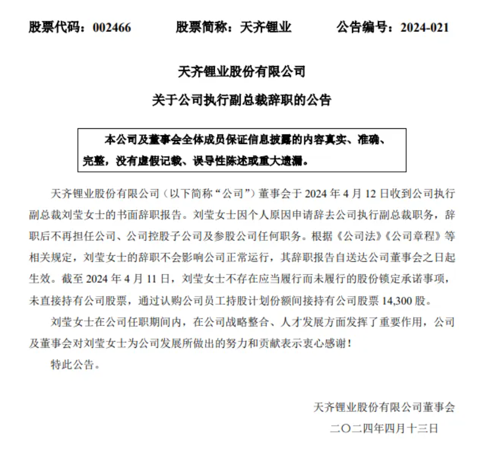天齊鋰業(yè)發(fā)布公告稱,公司董事會(huì)于4月12日收到公司執(zhí)行副總裁劉瑩女士的書面辭職報(bào)告。劉瑩女士因個(gè)人原因申請(qǐng)辭去公司執(zhí)行副總裁職務(wù) ,辭職后不再擔(dān)任公司、公司控股子公司及參股公司任何職務(wù)。根據(jù)《公司法》《公司章程》等相關(guān)規(guī)定,劉瑩女士的辭職不會(huì)影響公司正常運(yùn)行,其辭職報(bào)告自送達(dá)公司董事會(huì)之日起生效。