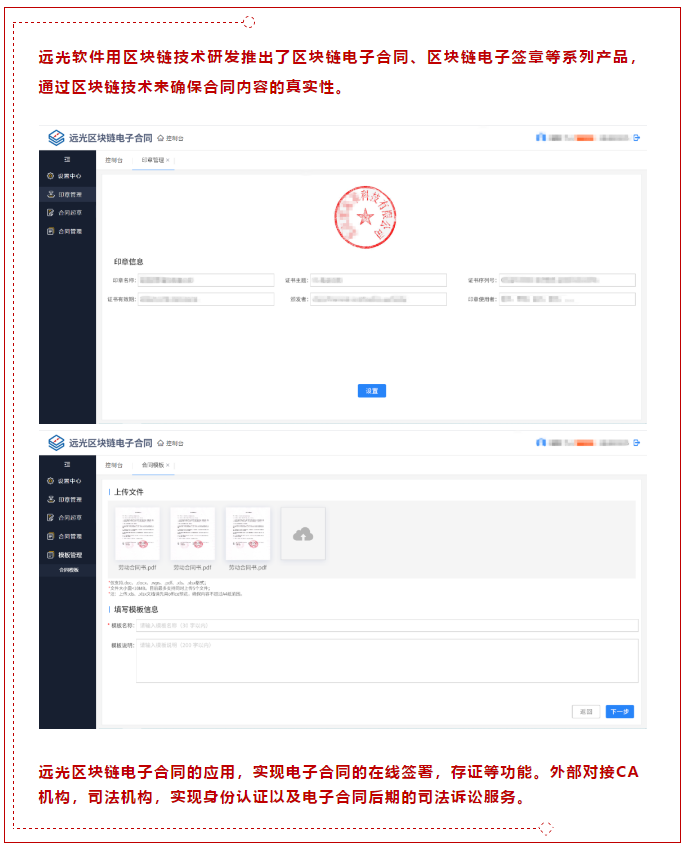 遠(yuǎn)光軟件用區(qū)塊鏈技術(shù)研發(fā)推出了區(qū)塊鏈電子合同、區(qū)塊鏈電子簽章等系列產(chǎn)品,通過區(qū)塊鏈技術(shù)來確保合同內(nèi)容的真實性。