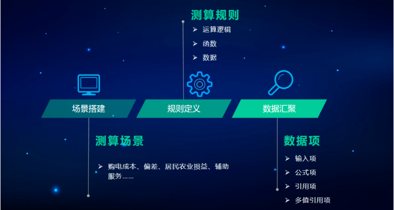 系統(tǒng)擁有龐大的數(shù)據(jù)項(xiàng)庫(kù)、函數(shù)庫(kù)與邏輯庫(kù),在應(yīng)用層面可以根據(jù)不同省份的實(shí)際情況,靈活配置,快速形成對(duì)應(yīng)的測(cè)算規(guī)則體系。數(shù)據(jù)項(xiàng)和規(guī)則在不同的測(cè)算場(chǎng)景中集合,以“代理購(gòu)電用戶測(cè)算”、“偏差測(cè)算”、“購(gòu)電成本測(cè)算”、“居民農(nóng)業(yè)損益測(cè)算”等場(chǎng)景,構(gòu)成一整套或多套代理購(gòu)電測(cè)算引用模型。每個(gè)場(chǎng)景相互呼應(yīng)、縝密配合、嚴(yán)謹(jǐn)規(guī)范,形成了代理購(gòu)電測(cè)算的整個(gè)體系。