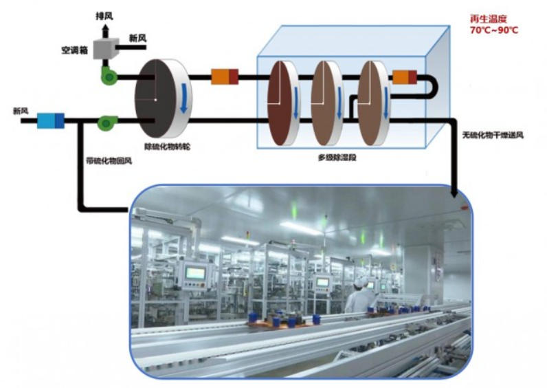 生產(chǎn)車間中濃度較低的H?S 氣體,會被除濕系統(tǒng)的負壓回風帶入除濕機內(nèi)部。該除濕機裝有活性炭過濾器/除硫轉(zhuǎn)輪,可先吸附硫化氫,再進行除濕。