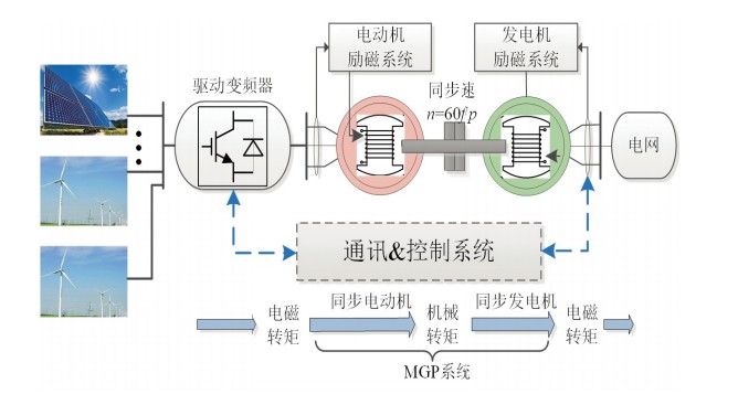 黃永章:目前新能源并網(wǎng)方法最大的技術(shù)問題就是它們是電流源,而非電壓源。新能源同步機這個方案的出發(fā)點是,同步發(fā)電機是傳統(tǒng)交流電力系統(tǒng)的基礎(chǔ),而且已經(jīng)被證明了非常有效。于是我們就提出,既然同步機這么好,為什么不把同步機保留下來,而一定要替換掉呢?如果可以保留,應(yīng)該怎么保留?答案就是用新能源驅(qū)動一個同步電動機,再用同步電動機帶動同步發(fā)電機發(fā)電并網(wǎng),這樣就把新能源電力轉(zhuǎn)變成了一個交流電網(wǎng)需要的電壓源。我們把這個裝置稱為同步電機對并網(wǎng)(MGP),隨著研究的逐步深入,我們又把這個方案叫作新能源同步機