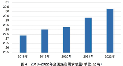 近五年來,全國(guó)煤炭消費(fèi)總量隨著GDP增長(zhǎng)同步逐年上升,2022年預(yù)計(jì)達(dá)到30.3億噸標(biāo)準(zhǔn)煤(見圖4)。