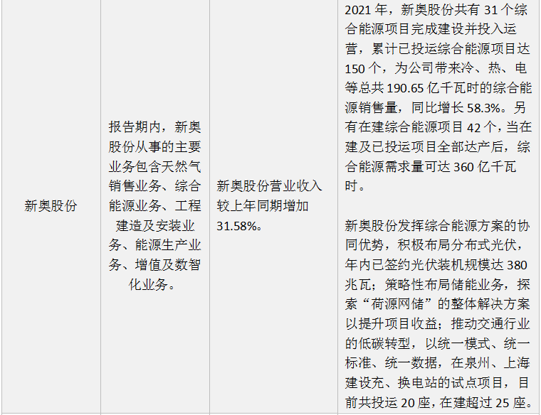 新奧股份2021年年度報(bào)告顯示,報(bào)告期內(nèi),公司營(yíng)業(yè)收入較上年同期增加31.58%,主要是公司所屬子公司天然氣業(yè)務(wù)(零售、批發(fā)、直銷)氣量增加、單價(jià)上漲,以及綜合能源業(yè)務(wù)快速增長(zhǎng)所致。在綜合能源業(yè)務(wù)方面,新奧股份重點(diǎn)開(kāi)發(fā)低碳園區(qū)、低碳工廠、低碳建筑、低碳交通四大類客戶,以綠色低碳整體解決方案切入,大力發(fā)展終端節(jié)能、工藝優(yōu)化、能源設(shè)施托管運(yùn)營(yíng)等用能側(cè)服務(wù)業(yè)務(wù)。
