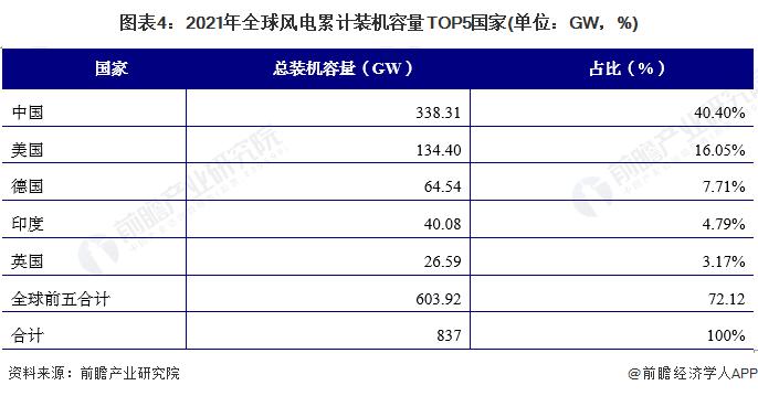 截至 2021 年底,全球風(fēng)電裝機(jī)總量 837GW,其中中國(guó)位居第一,裝機(jī)總量達(dá) 338.31GW,占世界總裝機(jī)容量的 40.40%; 美國(guó)風(fēng)電裝機(jī)總量為 134.40GW,占比為 16.05%,僅次于中國(guó) ; 德國(guó)雖然在 2021 年新增裝機(jī)容量不是很多,但作為老牌風(fēng)電強(qiáng)國(guó),累計(jì)裝機(jī)容量仍占了第三的位置,風(fēng)電裝機(jī)總量 64.54GW,占比 7.71%。印度和英國(guó)的裝機(jī)總量分別為 40.08GW 和 26.59GW,分別占比 4.79% 和 3.17%。中國(guó)和美國(guó)風(fēng)電累計(jì)裝機(jī)量占世界總裝機(jī)量的比例超過 50%,前五的國(guó)家占比超過 70%。
