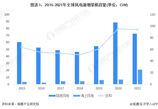 全球風(fēng)能理事會(huì) ( GWEC ) 發(fā)布的《全球風(fēng)能報(bào)告 2022》指出,得益于技術(shù)進(jìn)步和商業(yè)模式創(chuàng)新,風(fēng)能行業(yè)正在快速發(fā)展,2021 年全球新增風(fēng)電裝機(jī)容量 93.6GW,較 2020 年下降 1.8%。其中陸上風(fēng)電新增裝機(jī)容量 72.5GW,海上風(fēng)電新增裝機(jī)容量為 21.1GW,與往年相比,海上風(fēng)電新增裝機(jī)容量大幅上升。